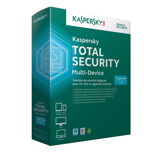 Kaspersky Total Security 1 an 5 postes est la solution de sécurité la plus complète pour protéger vos données personnelles, vos fichiers sensibles. Egalement, vos transactions bancaires et vos mots de passe contre les Cyber_menaces. Un seul produit sécurise l’ensemble de votre environnement numérique, ainsi que vos enfants, sur PC, Mac et Androïde.