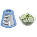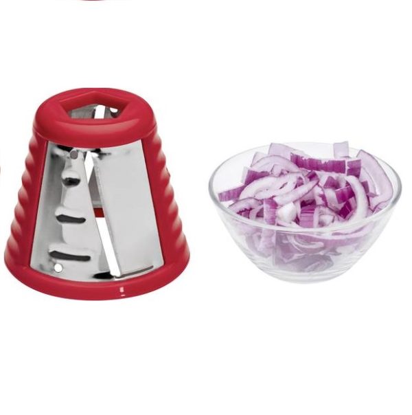 - Accessoires : 2 dispositifs de coupe (fin / épais), 2 accessoires pour râper (fin / épais), 1 accessoire pour trancher