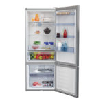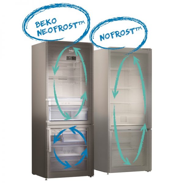 Réfrigérateur Beko Combiné Néo Frost inox 340L est doté de la technologie Beko Neo Frost. Il s’agit d’un total No Frost avec deux évaporateurs. Dans le congélateur, l’air est sec et évite la formation de givre. Dans la partie réfrigérateur, l’air est plus humide, ce qui permet aux aliments de se conserver plus longtemps.
