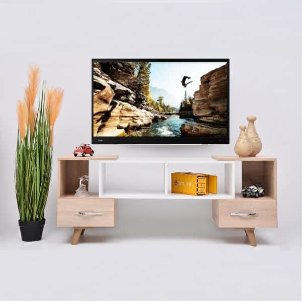 Disponible dans une finition couleur chêne et blanc. Ce support offre un espace d’organisation et une gestion des câbles tout en capturant le style parfait.